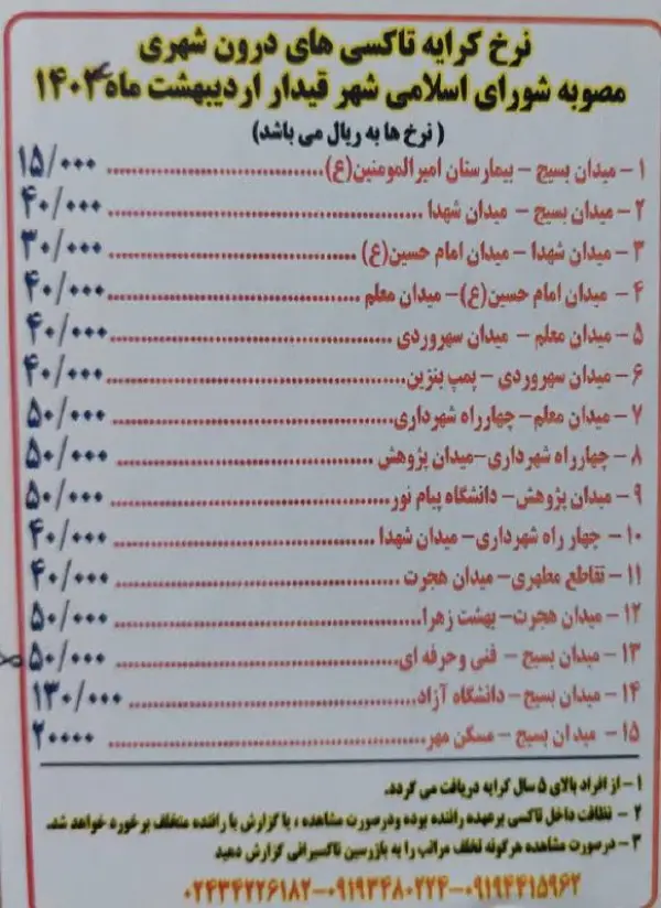 نرخ کرایه تاکسیهای درونشهری شهر قیدار مطابق نرخ مصوب سال جاری میباشد و از ابتدای سال تاکنون هیچگونه افزایشی در کرایهها اعمال نشده است.